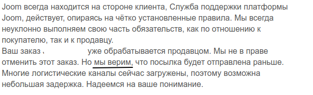 Придя домой, первым делом сфотографировал все дефекты, после чего сразу же было создано обращение в поддержку, отправлено видео-получение посылки и фото-доказательства, на что последовал вполне лаконичный ответ - "Ждите 3-5 рабочих дней". На комментарии и !извинения поддежка Joom не расщедрилась.