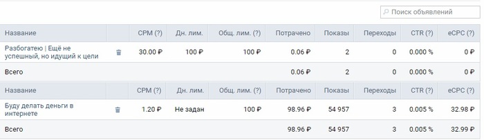 Попробовал на 100 р получить подписчиков сообщества вк. Чисто таргетированная реклама ВК. Неэффективно! 3 перехода и 60000 просмотров, 0 подписавшихся. Это была боковая реклама под меню ВК. Настроенная на группы конкурентов.