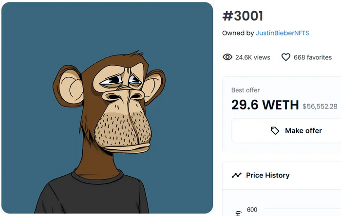NFT под номером 3001 был приобретен Бибером за 500 ETH. В настоящее время этот токен оценивается примерно в 29 ETH, согласно данным ведущего NFT-маркетплейса Opensea.