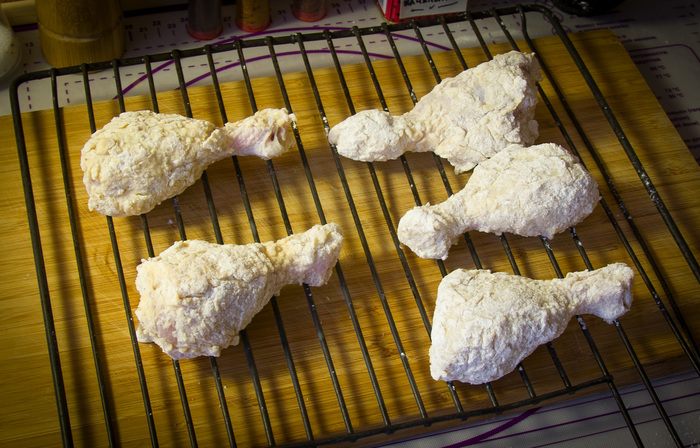 5) Хитрость №1 : возвращаем курицу на решетку чуть подсохнуть, чтобы панировка схватилась и не соскочила во время обжаривания.
