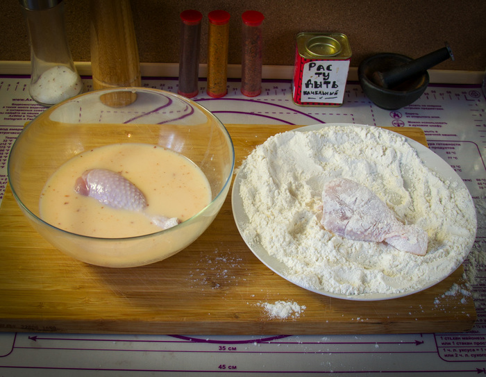 4) Начинается самое занудное - панировка курицы. Муку смешали с 1 ч.л соли, курицу обмакнули в муку, потом в маринад, потом в муку, потом в маринад, потом в муку. В смысле вы уже вылили маринад? Я сейчас вернусь в предыдущий пункт и напишу вам, чтобы вы не выливали маринад!