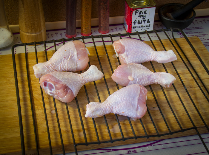 3) После маринования курицу вытащили, положили на решеточку чуть обсохнуть. Идея в том, чтобы маринад чуть засох на курице и стал немного липким. (прим. из будущего: НЕ ВЫЛИВАЙТЕ МАРИНАД)