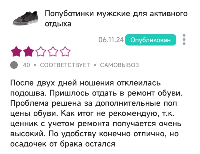 На самом деле на мою кривую стопу найти удобную обувь довольно таки сложно. как итог через 2 дня ношения отвалилась подошва, т.к. была просто приклеена. Но, я не стал пренебрегать комфортом и отдал в ремонт для прошивки и проклейки. Не собирался я обращаться по гарантии и прочее. ну и решил опубликовать отзыв на покупку.