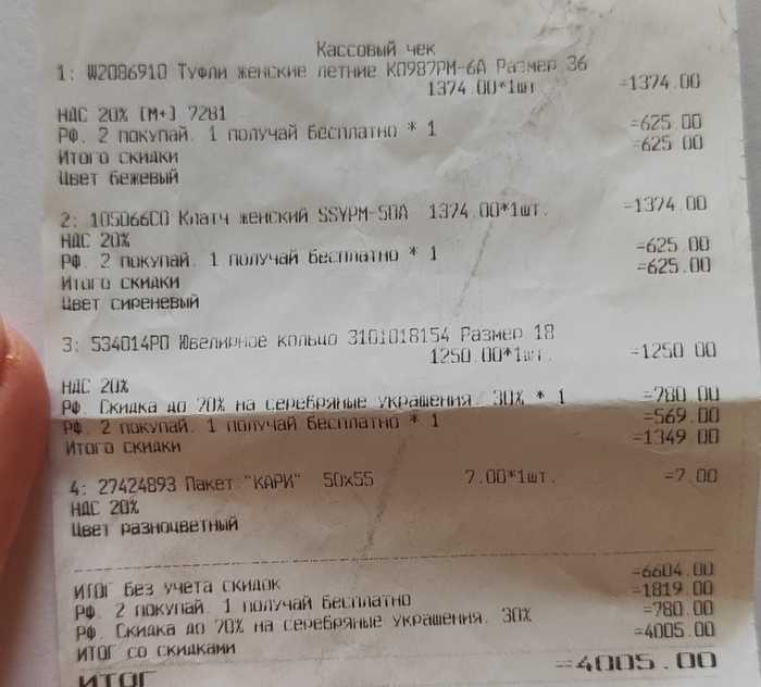 Теперь если я хочу вернуть туфли или сумку то считать будут не 1999р., а 1374р., но при этом еще и пересчитывается их акция 2=3, так что я еще за "подарок" должна останусь 1349р. То есть вернут мне 25р. Вот такое вот наебалово.