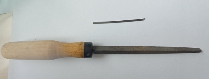 Откушенный кусочек немного доработаем напильником в области рукояти - её нужно сделать узкой под оплётку. Если у вас есть тиски - всё намного проще и быстрее! А если нет - может свести большой палец, как у меня)