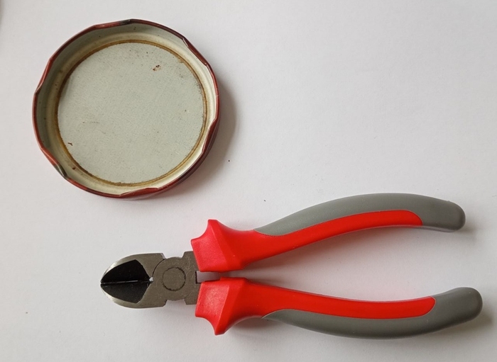 Для чего нам потребуется минимальный набор инструментов, который должен быть в хозяйстве у каждого мужчины. Прежде всего кусачки - чтобы откусить нужный кусок. (Поправка - пластинка оказалась неожиданно прочной и китайские кусачки никак не хотели её брать, пришлось взять мощные пассатижи, оставшиеся за кадром и перекусить ими)