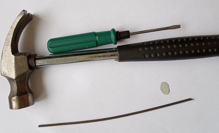 Может у вас даже есть кернер и мелкое зубильце или долото. Мне пришлось обойтись тем, что было, по минимуму - то есть остаток от куска и отвёртка.