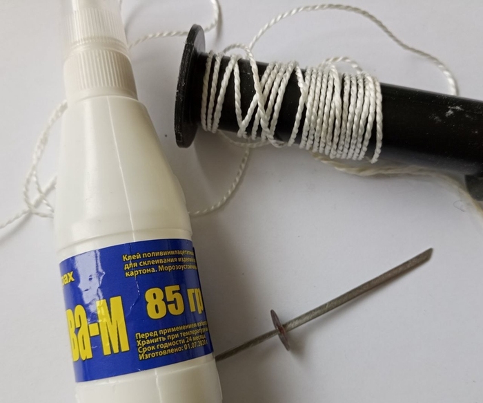 Я долго думал - где найти ленточку на оплётку. Однако оказалось, что если сильно наматывать капроновую нитку, остатки которой у меня завалялись, то она будет плющится и получится весьма похоже. Из клея под рукой нашёлся только ПВА. Плюсы: после застывания бесцветен, стынет довольно быстро. Минусы: очень плохо клеит как саму капроновую нить, так и нить к железу, так что пришлось набухать много клея и получилось что-то типа папье-маше из ниток) Но на самом деле когда всё высыхает держится уже довольно хорошо.