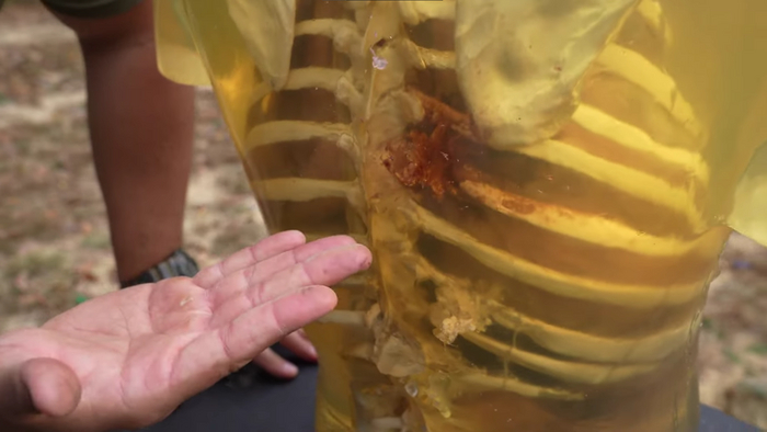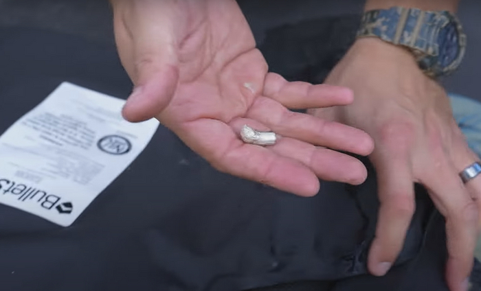 А эта пуля даже фрагментировалась. Причем судя по тому, что она остановилась в первом же кевларовом бронежилете, не пробив даже переднюю его сторону, такой она стала уже после соударения с волчьей черепушкой.