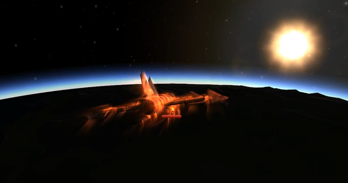 Через несколько минут, сорвершив разворот, корабль включил двигатели. Карни выбрала наиболее быстрый вариант входа в атмосферу. Для этого было необходимо как можно скорее выполнить небольшой прожиг перпендикулярно траектории орбиты прямо в сторону Кербина. Скорость относительно планеты это никак не понижало, зато меняло траекторию так, что перицентр оказывался на высоте в сорок пять километров. А это намного ниже линии Кармана, условной границы атмосферы. Остальное сделает воздух.