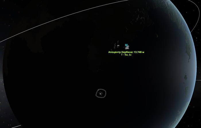 - Да пофиг. В общем, почти высота Муны. Перицентр - самая низкая точка орбиты - в районе южного полюса. Апоцентр - высшая точка - где-то над северным. В нашем случае полярная орбита нам на руку: воздействие Муны на такую орбиту минимально, не говоря уж о столкновении. Они в разных плоскостях.
