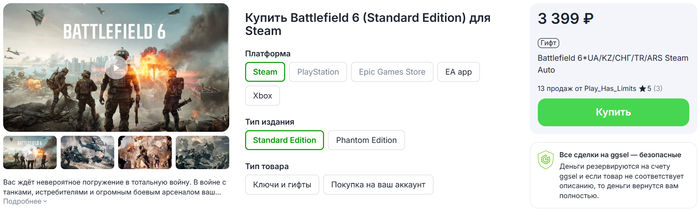 Переходим в категорию «Battlefield 6» и выбираем подходящий товар. Также, как и в предыдущем способе, смотрим на его критерии, внимательно читаем описание и оплачиваем.