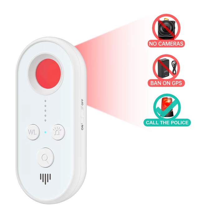 Компактный детектор для обнаружения камер, микрофонов и других устройств. Работает на основе инфракрасного излучения и определения беспроводных сигналов. Питается от встроенного аккумулятора на 300 мАч, подзарядка осуществляется через USB-C.