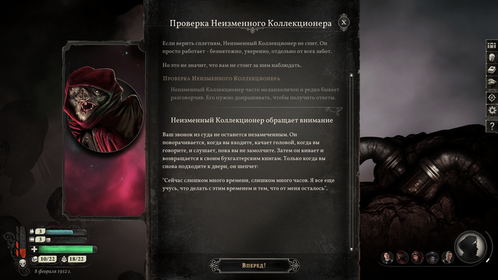 Другое дело, что в игре есть пара моментов, когда нам описывают значение сигила вроде «осознание, что завтра не наступит». Но таких моментов в игре можно найти считанное число и даже меньше, чем спонсоров, заплативших эти самые 500 фунтов — их было десять. Впрочем, возможно, что я тупо не всё знаю пока в игре и не встречал ещё этих моментов. Но даже если встречал, звучит всё равно как странное нечто.
