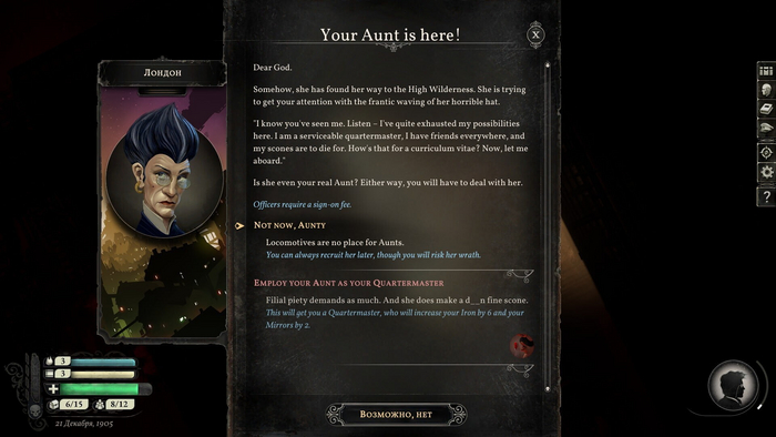 Вот здесь лично у меня некоторое недоумение, потому что с одной стороны, сюжет Неудобной Тётушки хорош тем, что охватывает три из четырёх регионов, да ещё и приоткрывает завесу над тем, как именно Её Высочество захватывала Трон Времени. Весьма занятная шпионская история. Но механически она сделана довольно простенько, и я молчу про то, что финальное ветвление её развития в Революционную Тётушку или Тётушку-Шпионку зависит от одного ответа.