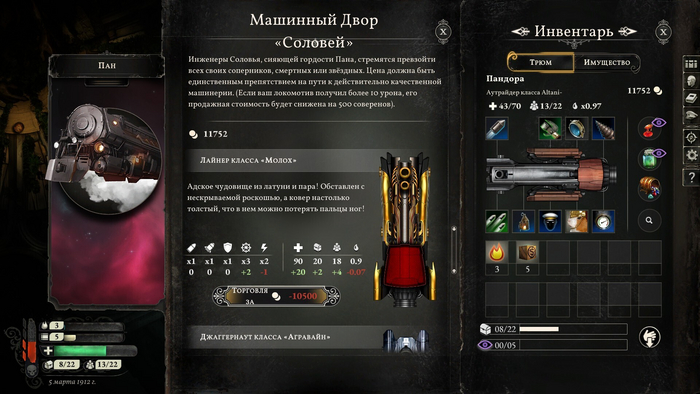 А вот тут уже более спорное решение, по крайней мере, каким оно представлено в финальной версии игры. Потому что Молох — это самый элитный из элитнейших локомотивов. Максимум выживаемости, максимальный трюм и каюты. Единственный минус на фоне Атланти из Эмпирея — два слота с молнией вместо трёх. Но полагаю, это лишь для меня будет минусом. В остальном это локомотив, позволяющий запастись припасами и топливом до второго пришествия и наворачивать круг за кругом по любому из четырёх регионов. И по описанию цели на этот локомотив выходило, что он должен был продаваться строго в Королевском Обществе.