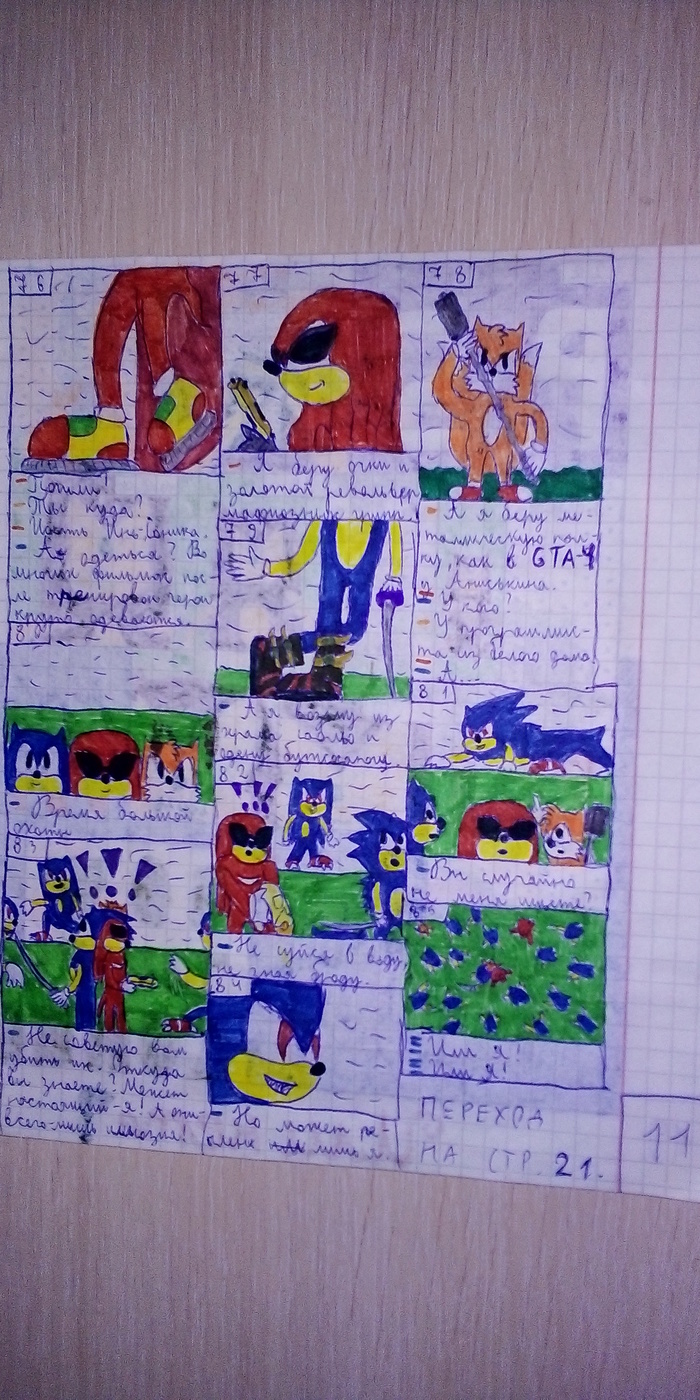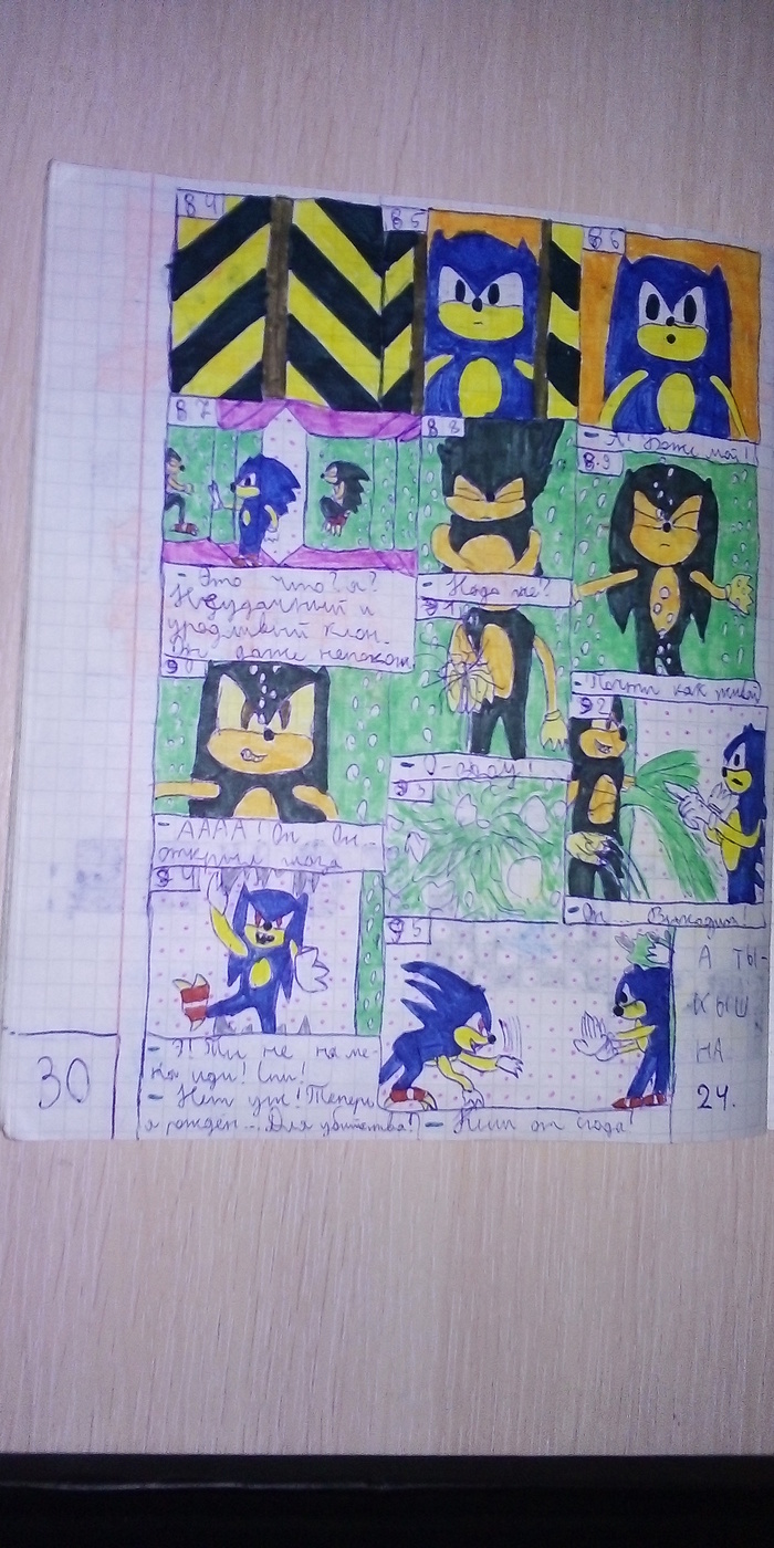 Так как известного мне ЛОРа были крупицы, да и те, жалки, мне было крайне тесно в рамках канона. Рисовал я много, переводя пачки фломастеров и разрисовывая тетрадку за тетрадкой. Сохранилась бы вся коллекция, можно было бы увидеть и оценить всё больший и больший разгул фантазии от первого комикса, бережно и щепетильно приближенного к реальности (основанного на сюжете Sonic The Hedgehog 3 и Sonic & Knuckles), но постепенно сюжет вышли за пределы канона, ЛОРа, стали пафоснее и кровавее. Ну а что вы хотели? Я был школьником, делавшим комиксы и чувствовал полное моральное право наводить в сюжет глобальности, пафоса и кровищи с кучей отсылок.