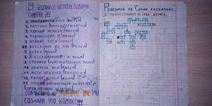 И пост этот был бы просто фанатским ностальгическим, если бы недавно я случайно не раскопал два, сохранившихся сквозь десятилетия, комиксов. Комикс этот был уникален тем, что во-первых, я его рисовал остатками фломастеров разных наборов (и даже местами недокрасил, что не страшно), что в нём во-вторых полно отсылок и шуточек, ну а в-третьих, это был первый (насколько я помню) комикс с нелинейным сюжетом, развилками и многими концовками.