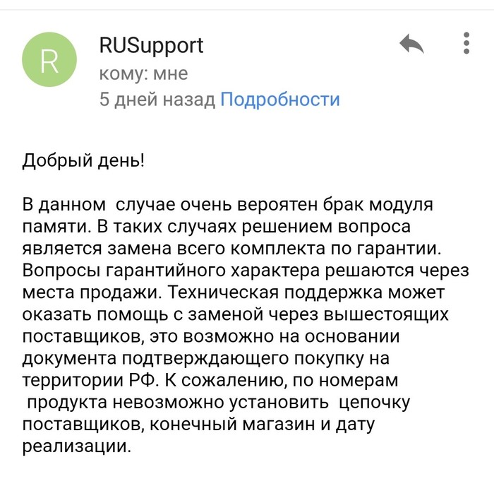 На один из праздников подарили мне оперативную память HyperX FURY от известного производителя Kingston. Достаточно долго ей пользовался и пользовался бы дальше, если случайно не обнаружил, что из 8 гб. мне доступно почти 4 гб. Полностью увереный в зарубежном производителе, т.к. имел опыт обращения в сервисный центр одного производителя телефонов, где не потребовалось ни чего кроме телефона, я отправился писать письмо в тех. поддержку вооружившись скриншотами и фотографиями модулей оперативной памяти. Вот и оно: