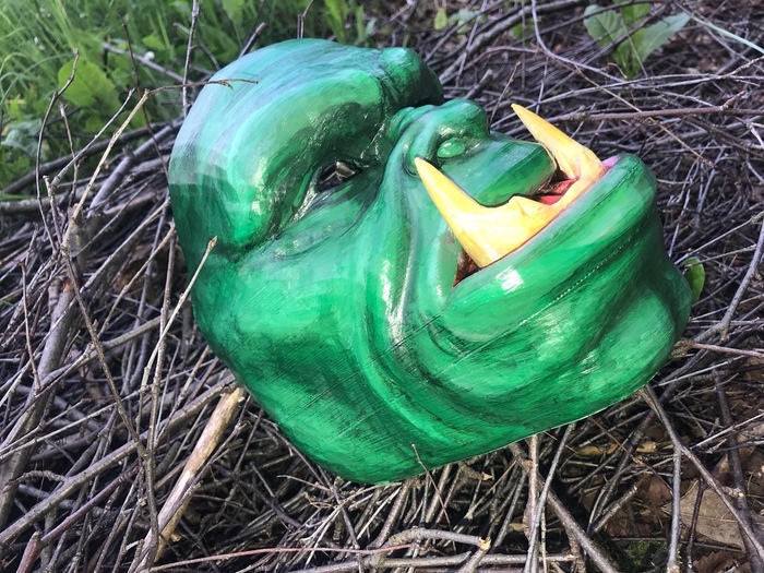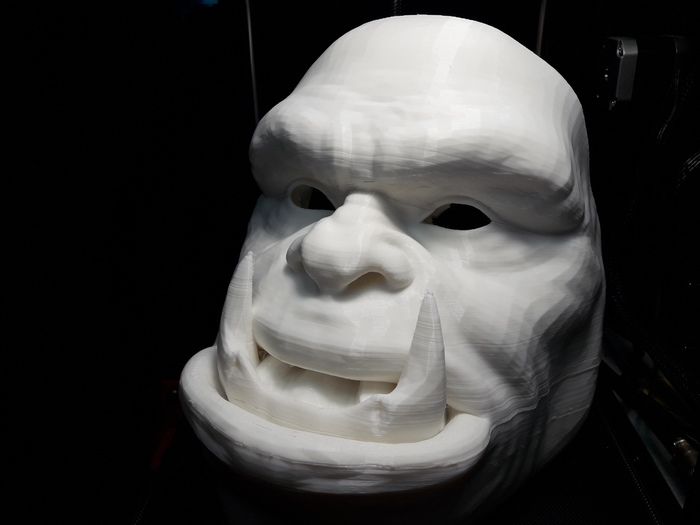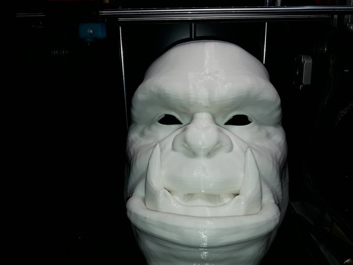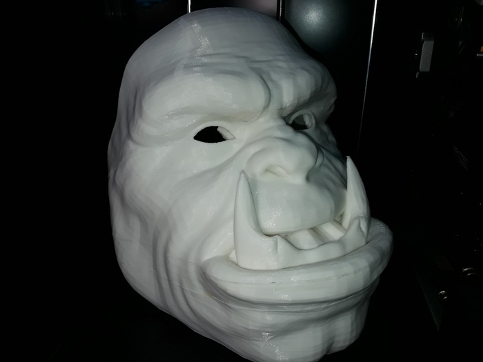 после этого была доработана и напечатана, взятая с тингиверс, маска орка. была немного обрезана со стороны висков, лба, подбородка. Разбита на 4 части - для минимизации печати поддержек, печать и склейка на ДХМ. окраска производилась заказчиком уже.