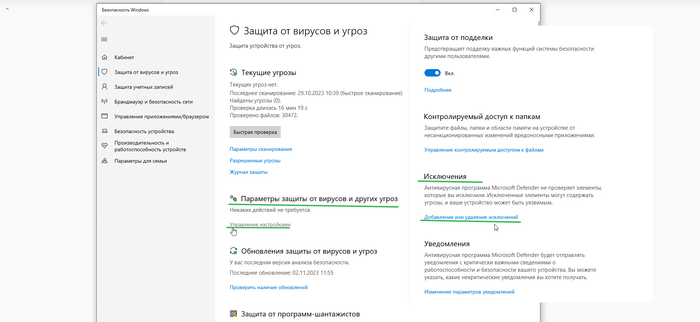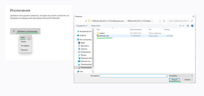 «Безопасность Windows»→ «Защита от вирусов и угроз»→ «В пункте Параметры защиты от вирусов и других угроз нажимаем кнопку Управление настройками»→ «Находим пункт Исключения и нажимаем кнопку Добавление или удаление исключений» → «добавляем сам файл, KMSAuto Net, а не папку в исключения».