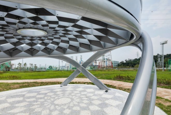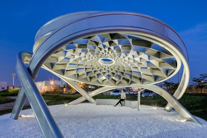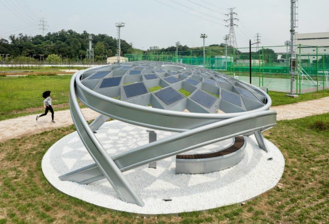 Мы привыкли, что солнечные панели — это сугубо утилитарное решение: прямоугольные модули на крыше или в поле. Внешний вид — вторичен. Но архитекторы бюро HG-Architecture из Южной Кореи сделали ставку на эстетику. Они представили городские зоны отдыха Solar Pines, форма которых вдохновлена сосновой шишкой.