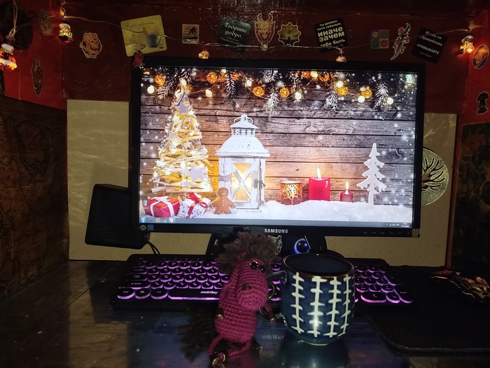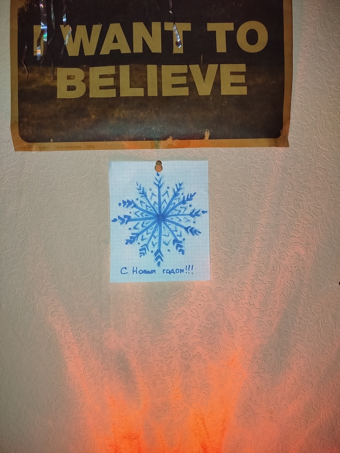 Над монитором светится гирлянда. Камешки и окаменелости пока лежат на самом видном месте, потом сделаю перестановку на полке, где хранятся мои другие подобные сокровища, и они переедут туда. Снежинка на стене, потому что я верю) Весной я посажу капусту, тыковку и вот то, вообще не знаю что. И пусть только посмеют не вырасти!