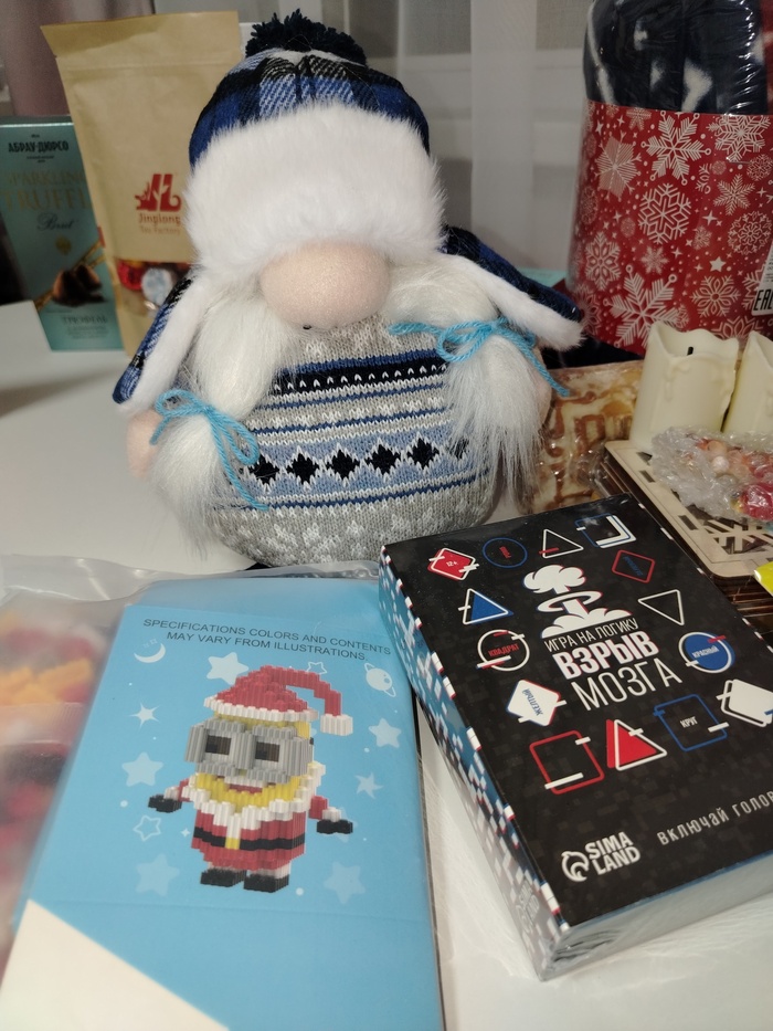 Дальше ждали подарки, уютный тёплый плед, куча сладостей, вкуснейший чай пуэр, магниты и пряники из города дедушки, конструктор, деревянный сборный домик со свечками, игра, носочки и термос, лакомство для собаки. Письмо от Дедушки Мороза)