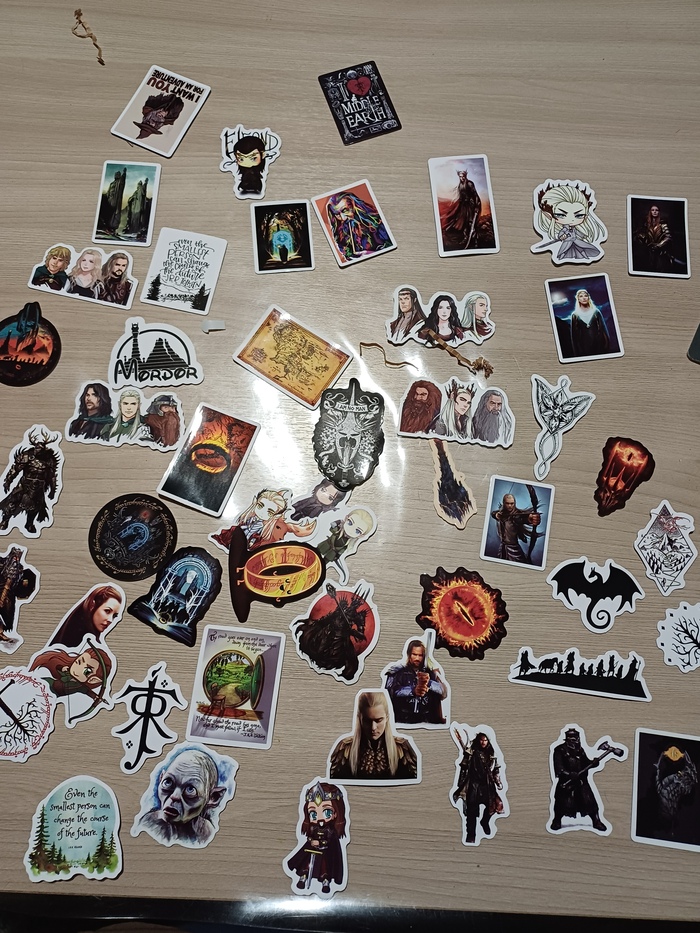 Но это ещё не все! В загадочных конвертах меня ждали дополнительные сюрпризы: целая куча наклеек по "Властелину Колец" и "Хоббиту", ключница в виде Тардиса (да, я люблю сериал "Доктор Кто"), тематический значок с котогэндальфом и заряженный позитивом новогодний лось.