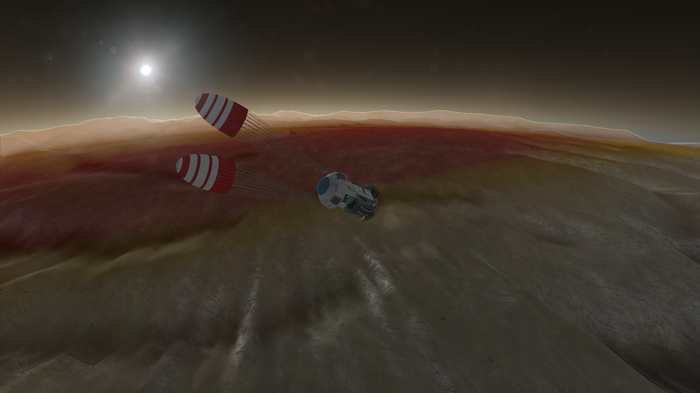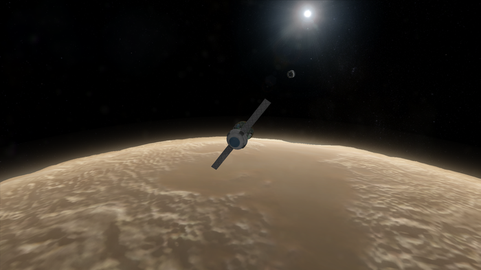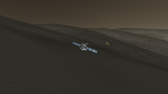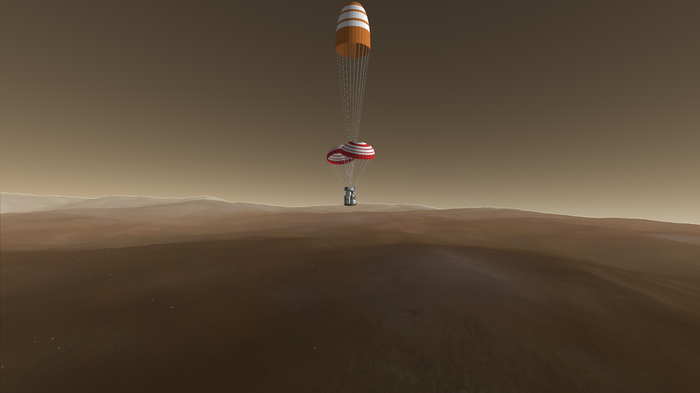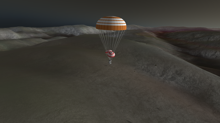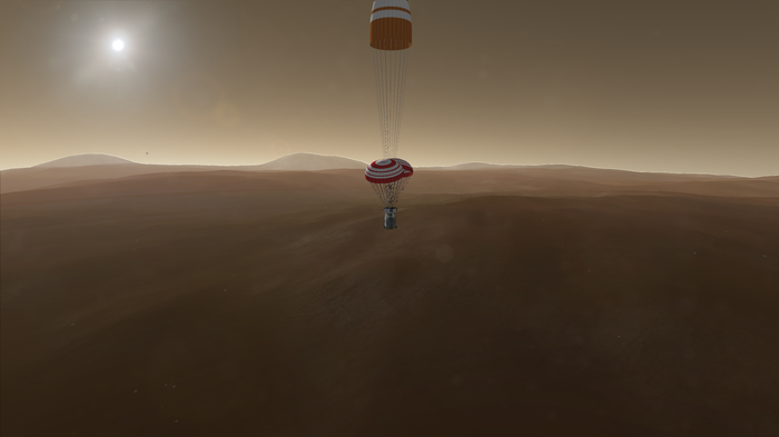 Остатков топлива во взлетно-посадочной ступени хватило, чтобы доползти до стратосферы Гаэля. Восемь витков - и мы сели, причем начиная с пятого в атмосферу входил уже отключившийся зонд, потому что солярки отгорели ещё на первом витке аэробрейкинга. Но парашют раскрылся и зонд сел. Я так нервничал, что даже забыл проскриншотить миссию до конца.