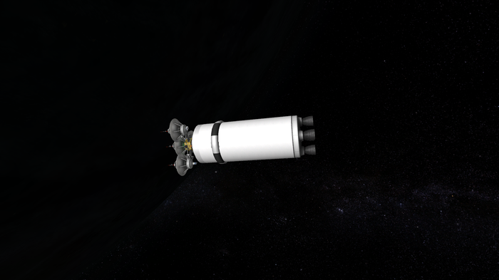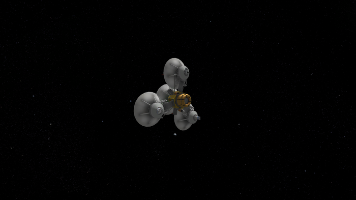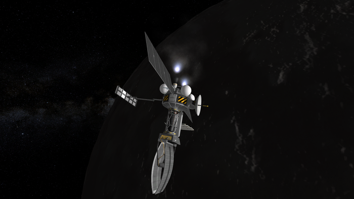 Кроме того, параллельно была запущена первая действительно межпланетная АМС. Цель - Нивен, картографирование и определение места будущей первой посадки. Конструкция довольно простая - ретрансляционная тарелка, блок электропитания и управления, окутанный неподвижными солярками, блок научного оборудования, резервный блок управления, с четырьмя смонтированными на нем поворотными солярками, много мелких бачков на 200 монопропа каждый (на случай утечек) и четырехкамерный монотопливный движок. Забегая вперед - станция оказалась на редкость удачной.