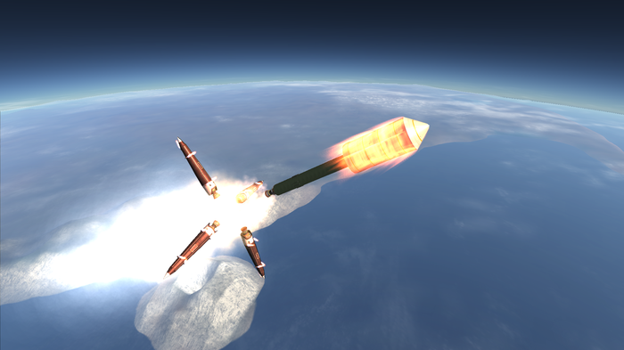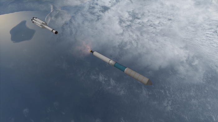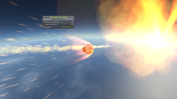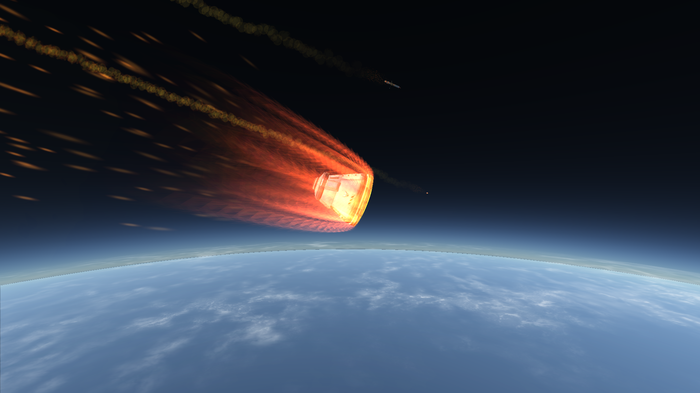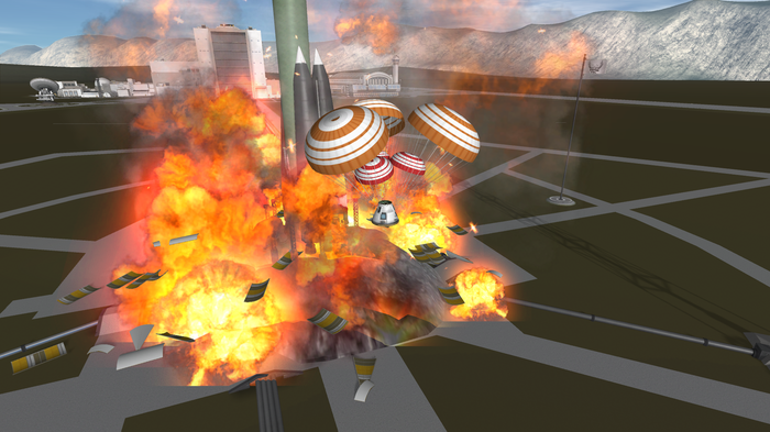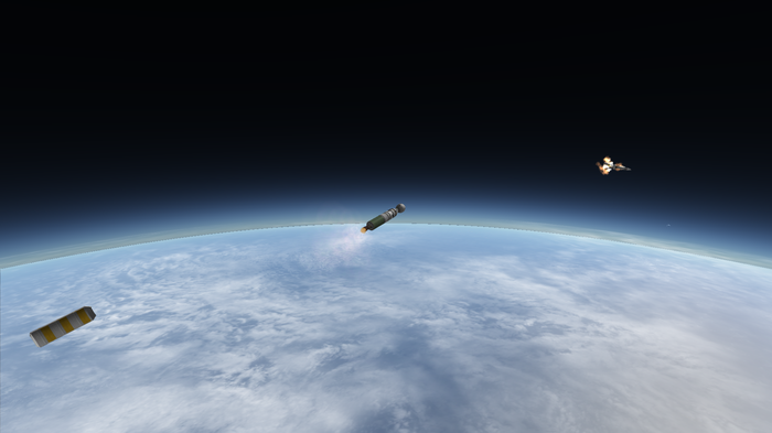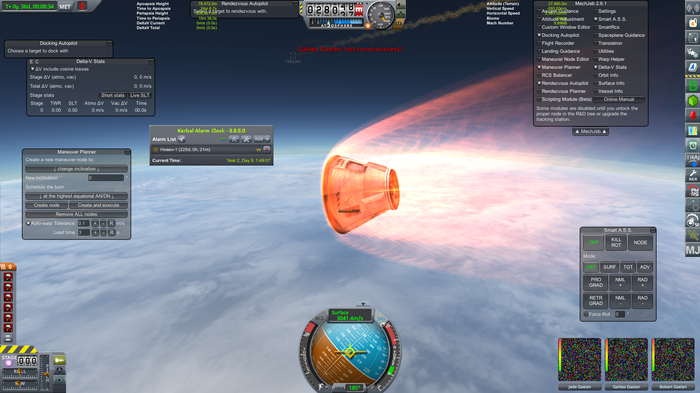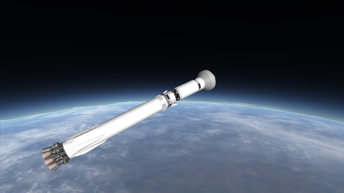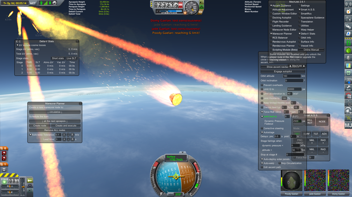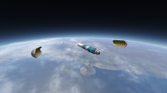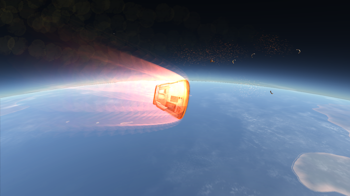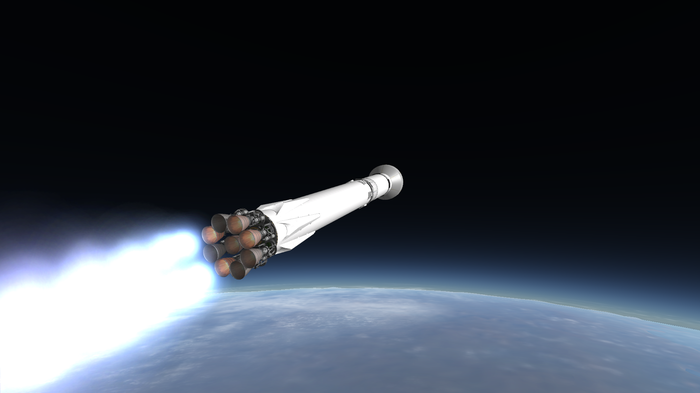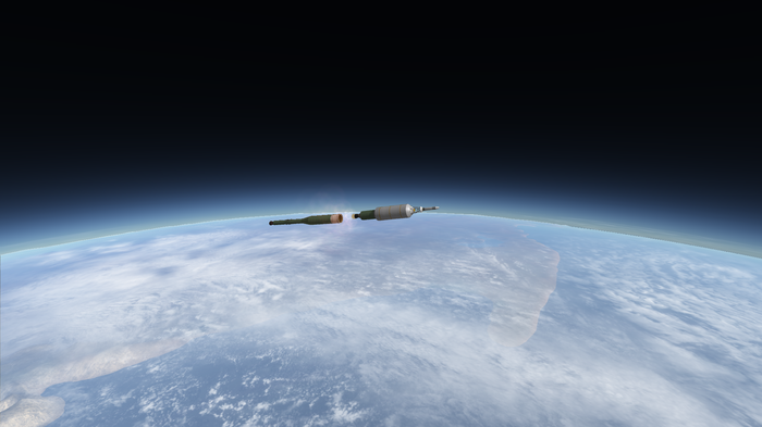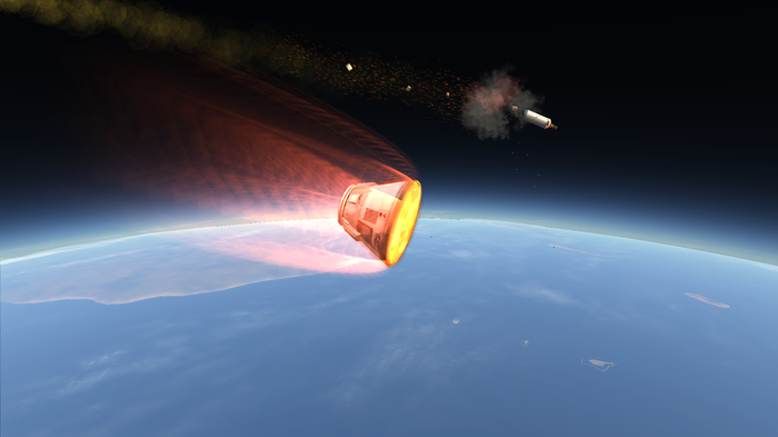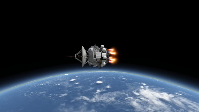 Поскольку вот здесь я выполнил один облет Цети - надо было на неё садиться. НО при этом надо было провести кое-какие работы в открытом космосе. В общем, взял я инженегра. Проблемы пошли ещё на взлете - отказали два двигателя через секунду после старта. Ну хорошо, хоть не взорвались. В остальном взлет прошел успешно, "Аполло-2М" вышел на орбиту и отправился к Цети. "Аполло-2М" отличается от "Аполло-2" двигателем приборо-агрегатного отсека - один вместо пяти, просто этот один по итогам более надежен, поскольку использовался до того во множестве рутинных бабкозашибательных миссий, на растаскивание спутников по орбитам. В ходе перелета выяснилось, что в отличие от двух пилотов и ученого инженер хочет больше пространства - хабитейшен стандартного "Аполло-2" исчезал на глазах, пришлось ограничиться пролетом и скорректировать орбиту в атмосферу Гаэля. И всё равно, в атмосферу вошел корабль уже с поехавшими кукушкой космонавтами. Едва не сгорел, но на счастье, декуплер прогорел раньше кабины и дальше аэродинамика развернула посадочную капсулу щитом вперед, а предусмотрительно взведенные ещё на орбите Цети парашюты посадили капсулу.