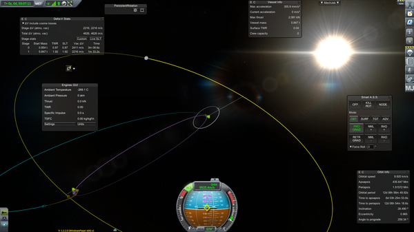 Через несколько минут модуль был успешно выведен на орбиту. Как всегда Джеб скорректировал курс сближения с Галилеем маневровыми двигателями так, что расстояние в ближайшей точке рандеву составило всего 200 метров.