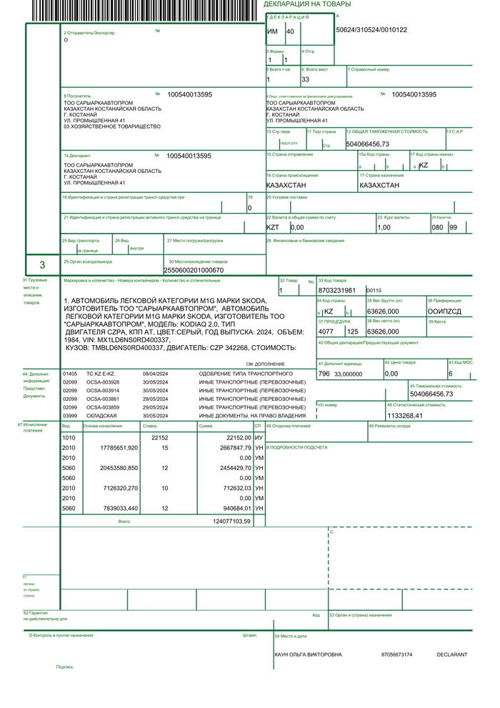 Поле 41, сначала идёт код 796 он означает "штуки". Потом количество - "33" авто (одинаковых по типу, товары могут различаться, но не сильно). Поле 45 таможенная стоимость за 33 авто - 504 066 456 тенге.