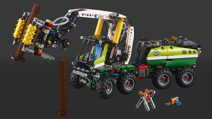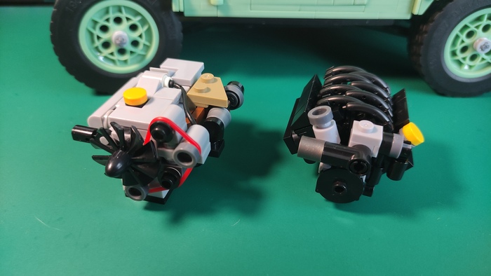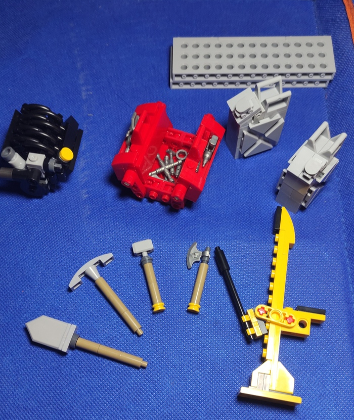 Место них положили закругленные 1 на 1 и наклейки на них. Так что разницы вы не заметите. Насчет наклеек, что интересно китайцы добавили еще и прозрачную наклейку с названием модели( и она смотрится гораздо удачней, нежели ЛЕГОвская которая не попадает в цвет детали). Переходим к сборке - Первый этап это сборка инструментов, домкрата и одного варианта двигателя. Кстати канистры напоминают такие же в наборе Арктический внедорожник 42069.