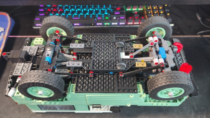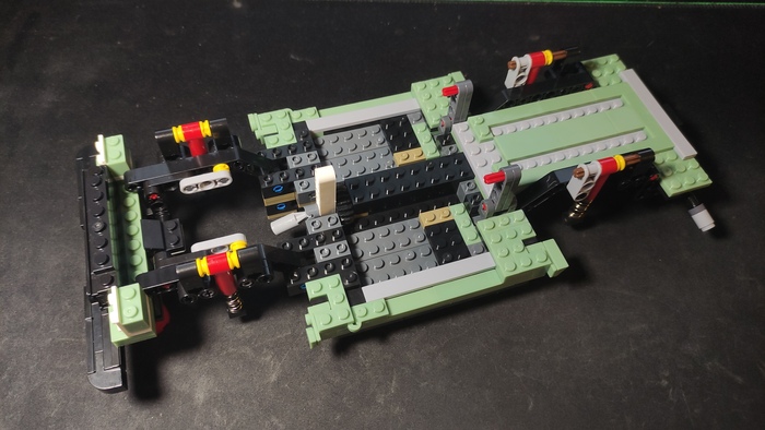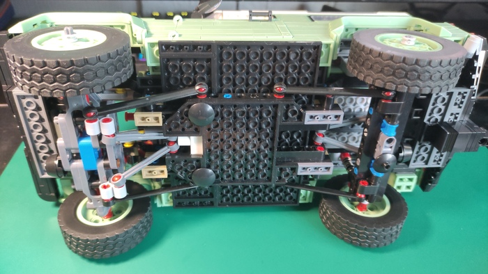 Далее собирается подвеска и устанавливаются 62 колеса (в отличие от раннего лепина резина практически не отличается от аналогичной леговской. Приятно радует проработка днища и мостов. Это на моей памяти первый ICON набор с рабочей подвеской из техника.