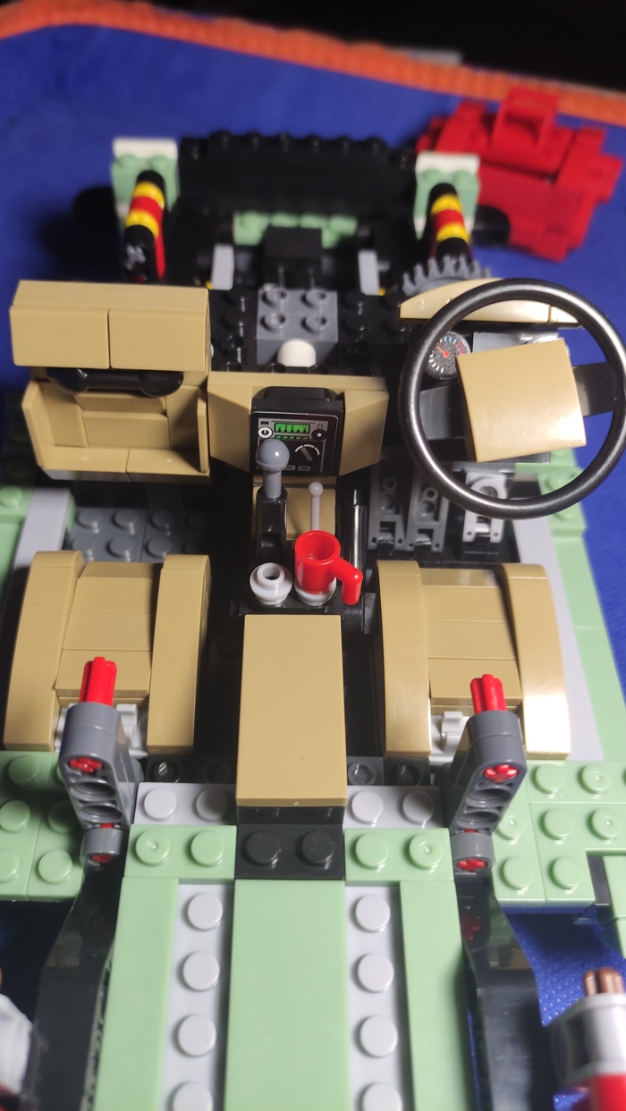 От зада движемся к переду, и собираем голову, двигатель, массивный бампер и видим место водителя. Поворот кабины осуществляется с помощью малых актуаторов. На этом этапе можно подкинуть батарейный блок и проверить работоспособность конструкции
