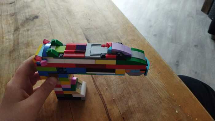Нашел видосик на ютубе, где умелец как раз из лего собирает глок. Спустя 3 дня, чередуя сборку и поиск нужных деталей, работа была завершена. Пистолет получился со съёмным магазином, двигающейся крышкой затвора и возможностью поставить пистолет на затворную задержку с помощью двигающейся детали (фото №4).