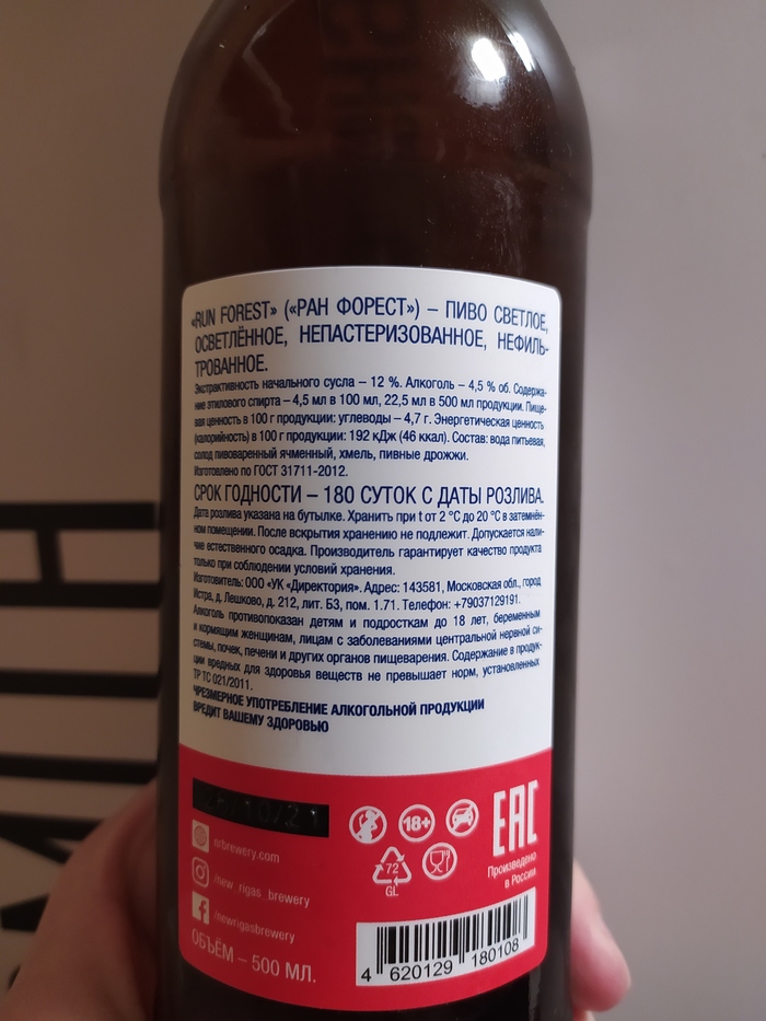 В случае с алкогольными напитками вообще и пивом в частности этикетка формально делится на две-три части: фронтальную, заднюю — так называемую контрэтикетку, а также, опционально, кольеретку (маленькая наклейка на горлышке). Так вот, контрэтикетка — это в некотором смысле паспорт напитка, оформление и содержание которого строго определено законами. За все, что на ней указано, производитель отвечает задницей и собственными деньгами: почти любой косяк на «контре» — это потенциально серьезный головняк для пивоварни и повод для контролирующих органов выписать крупный штраф, а то и вовсе изъять партию пива из оборота. К слову пиво вполне может получить статус «нелегального» всего лишь благодаря найденному на контрэтикетке нарушению.