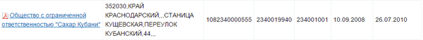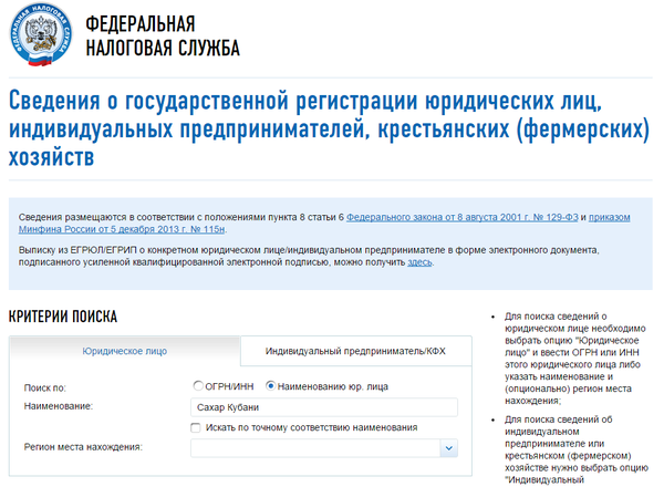Хмм... Вызов принят! Переходим на сайт Федеральной налоговой службы и в графу поиска вбиваем "Сахар Кубани"