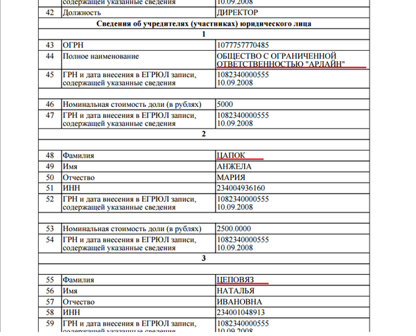 В учредителях значатся Цапок и Цеповяз (те самые жены бандитов) и некое ООО "АРЛАЙН".