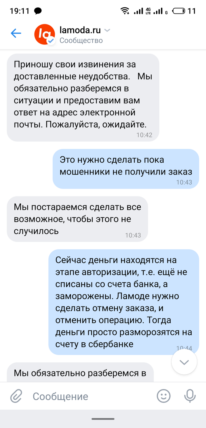 Так вот, я подумал что сейчас получится слалать так же. Тем более, мошенник наверняка ещё не успел получить заказ, прошло несколько часов. Поэтому я написал в Ламоду. Но, как оказалось зря..