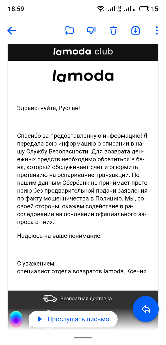 Покупка наверняка уже получена. Деньги поступили Ламоде на счёт. А в полиции даже не будут этим заниматься. Понятно что сумма небольшая. Но, ведь покупка могла быть на большую сумму, и ответ был бы таким же