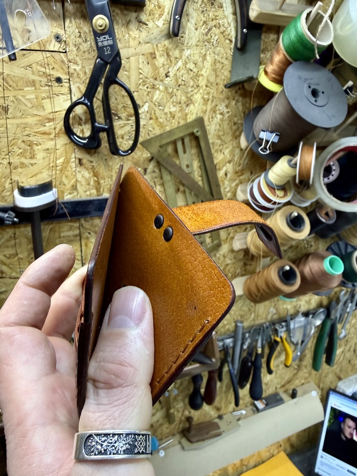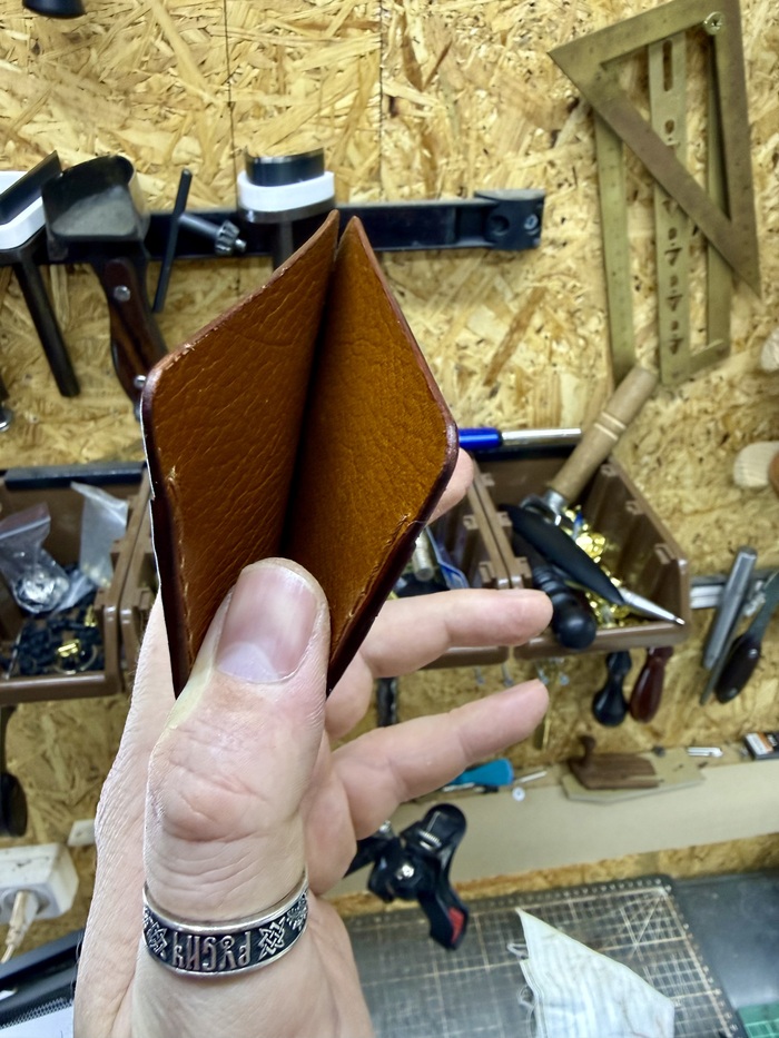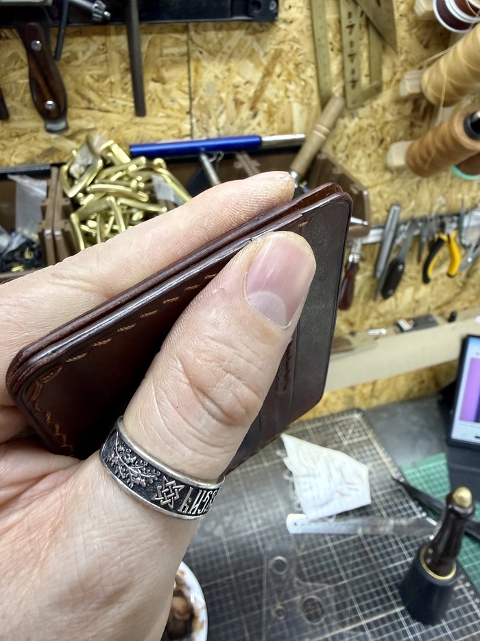 Прошу поделиться вашим мнением. Дело вот в чем. Я тут немного изменил самую популярную среди моих заказчиков модель картхолдера (маленького кошелька для карт). В общем, он теперь тоньше, с кожподкладом в основном отделе, карманы сделаны в подгибку и я убрал хлястик с кнопкой.