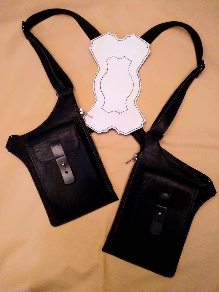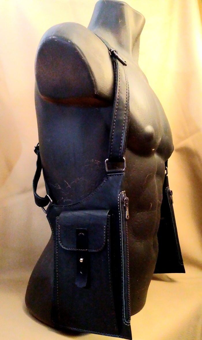 Сшила еще один вариант мужской сумки-кобуры, портупеи, разгрузки) много названий. Аналог бананки в общем. Этот вариант больше как скрытого ношения, то есть можно носить под пиджак. Но можно и поверх футболки, худака в теплое время года, тем более сделала так, чтобы кожа на ремнях и центральном элементе на спине не контачила с одеждой. Бывает что кожа красит, если намокнет от пота например. Вот я и сделала центральный элемент на спине с подкладкой из белой кожи, а ремни нашила на стропы из полиэстера. Ремни регулируются, карманы вместительные, на мой взгляд, вещь функциональная