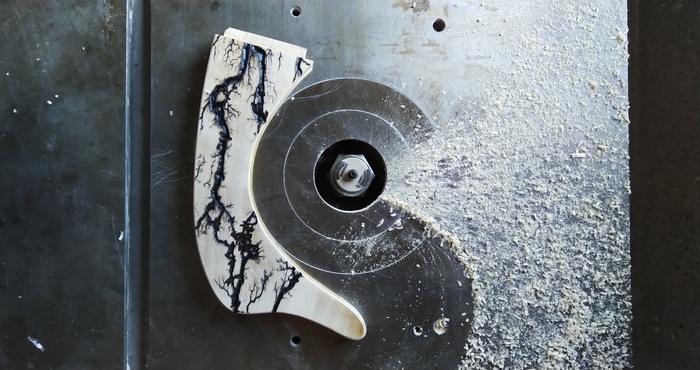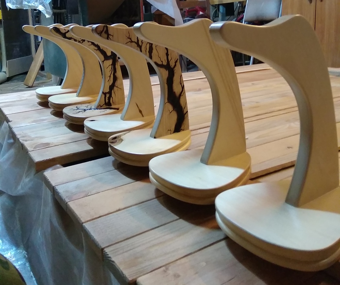 Продолжу. Хотелось сделать подставку универсальной, чтобы она не только держала наушники, но были в ней и дополнительные опции. Добавил гнездо USB под зарядку беспроводных наушников, пока висят на ней. Даже в планах было добавить беспроводную зарядку телефонов, но в экспериментах выяснилось что катушка неплохо так разогревается и всё содержимое моей тайной коробочки будет находиться в некомфортных условиях. Пришлось отбросить эту идею. Даже хотел было встроить в неё аккумулятор, но и эту затею я отбросил, мало-ли что может с ним произойти и никак не хотелось создавать штуку, которая из-за брака или ещё по каким-либо причинам могла полыхнуть. Ведь литий прекрасно горит на воздухе. Добавил независимую подсветку USB гнезда, добавил датчик света, для того чтобы светодиоды в тёмное время не слепили, а в светлое были видно освещение. Тут началось моё экспресс обучение от тестя в столярке. Евгений Самуилович отличный мужик, много чему научил, подсказывал что и как нужно делать и про безопасность давал наставления. Большое ему уважение, здоровья и долгих лет жизни. Смастерил трафареты. Началось изготовление первого тестового образца. За пару сдвоенных выходных всё было готово, дерево распилено, обработано, электроника прошита спаяна и смонтирована. Я был доволен как слон. Устроил фотосессию. И дальше был только один вопрос – нужно ли делать ещё? Ответ не заставил себя долго ждать, наступило время локдауна Covid19, на время которого работа меня послала на удалёнку, пока на месяц. Я же сразу без раздумий махнул в деревню, где всё и закипело. Выпендриваться не стал, взял мягкое дерево, под рукой была липа. Вполне для меня хороший материал, главное лёгкий в работе, но вонючий будто коты нассали)) И к счастью это всё только во время обработки. Модернизировались шаблоны, создавались новые версии приспособ для обработки. Забегая вперёд скажу что много совершил ошибок, на конечный результат не влияющих, но прибавляющих время изготовления заготовок. Постоянно всплывали моменты и понимание того как можно было облегчить производство и его оптимизацию. Меня же время никак не торопило, я получал истинное удовольствия от каждого дня, проведённого с своей идеей. Была весна (календарная) снег ещё лежал. Подъём в семь, брёвна, колун, хотя нет, дровокол служил верой и правдой, поленья, мастерская, буржуйка, спички, юшка, дверь поплотнее чтобы тепло в мастерской не растворялось как сахар в кружке и завтрак. Через часик можно было обойтись без дополнительного утепления луковой моды. И так каждый день. Без выходных с восьми до двадцати двух с перерывом на обед и нужняки. Так хорошо время никогда не проводил. Делал то, что нравиться. Месяц продлился продлением ещё на месяц, чему я был несказанно рад и продолжал творить и создавать. В ход пошли и доски с фигурами Лихтенберга, их то в последствии у меня разобрали в первую очередь. А вот обработка их была немного опаснее, берёза по сравнению с липой очень твёрдая порода, и из-за отсутствия опыта и не отлаженного производства было несколько моментов, где мои пальцы могли стать короче или просто гематомой на животе. Нужно было сделать глубокий паз для ленты и рассеивателя света. После очередного отскока детали от фрезера я просто начал его боятся, вплоть до того что хотел забить на всё(((. Отбитым ладоням и кистям просто давал о