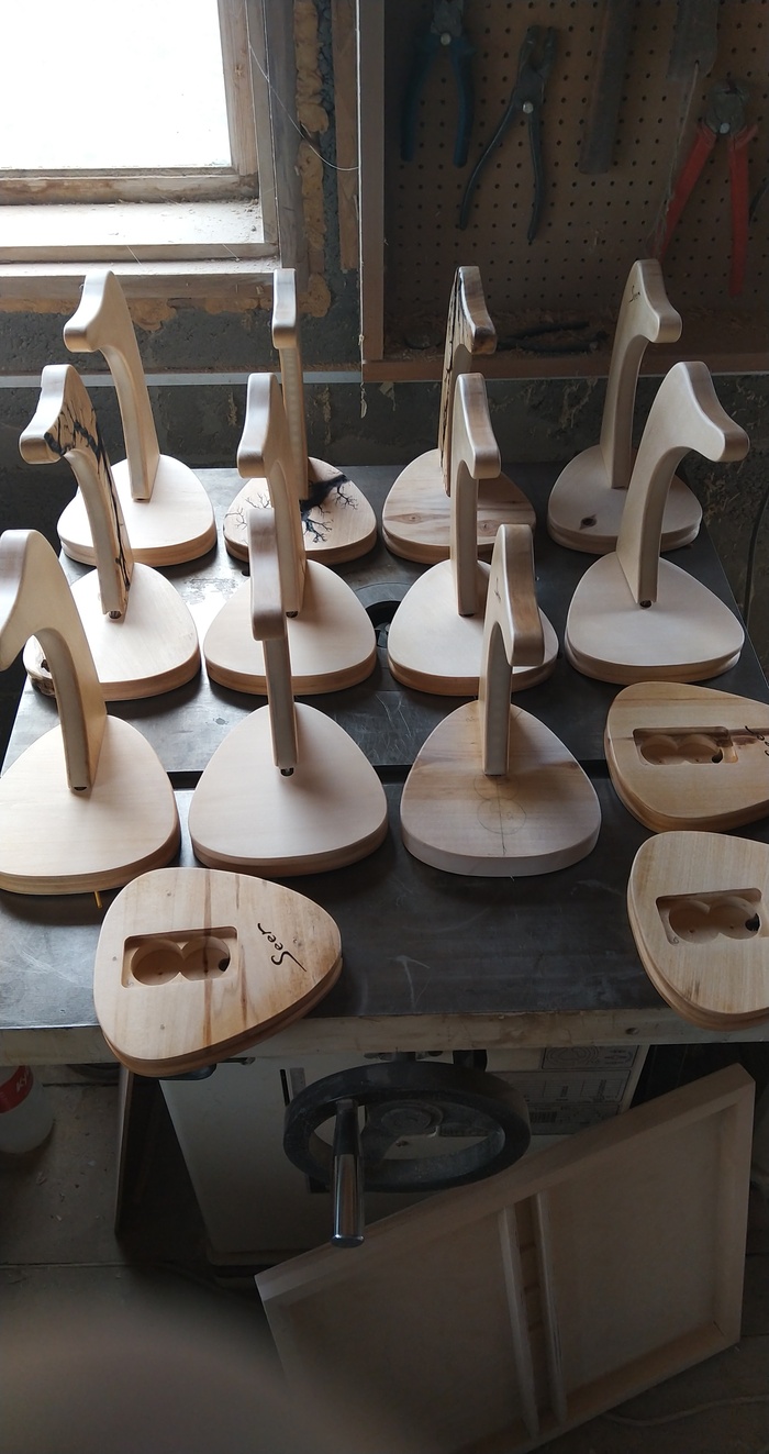 За два месяца изготовил десять полностью рабочих и такое-же количество комплектующих, на сборку которых не нужна мастерская, продолжить я смог бы и в городе. Был курьёз с лакировкой, вернее последствия не соблюдения техники безопасности. Промывая растворителем аэрограф, зачем-то решил глянуть в ёмкость для лакокрасок, нажал на спусковой рычаг, ну и как итог растворитель в лицо и глаз, два дня не мог работать, ночь не спал, будто наждачку под веки положили. Так быстро я никогда не бегал, как в тот вечер, к раковине для промывки глаза. Локдаун закончился, мой чирик подставкок смотрел на меня и радовал. А там и снег растаял, лето на носу. Разместил в Etsy, Ярмарке мастеров, и ещё парочке магазинах. Раздобыл картона, наделал коробок для упаковки. И сидел ждал. Вообще-то не сидел, работал на работе, я айтишник по образованию, стаж уже наверно к восемнадцати годам доходит. А это вот всё выше описанное моё хобби. Не могу просто сидеть и ничего не делать. Последние полтора года живу без дивана и телевизора, понимаю, что отсутствие оных никак не напрягает, они мне просто не нужны.