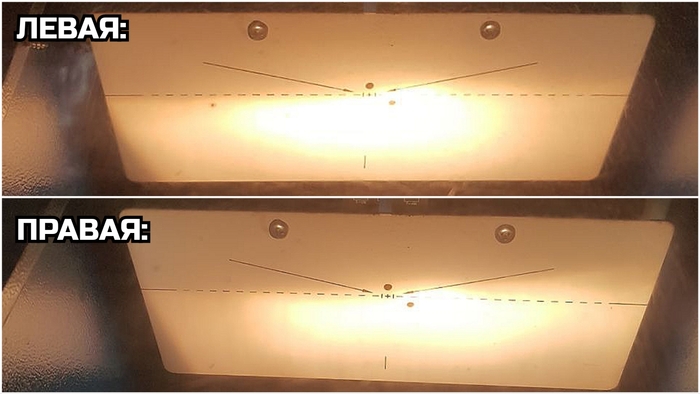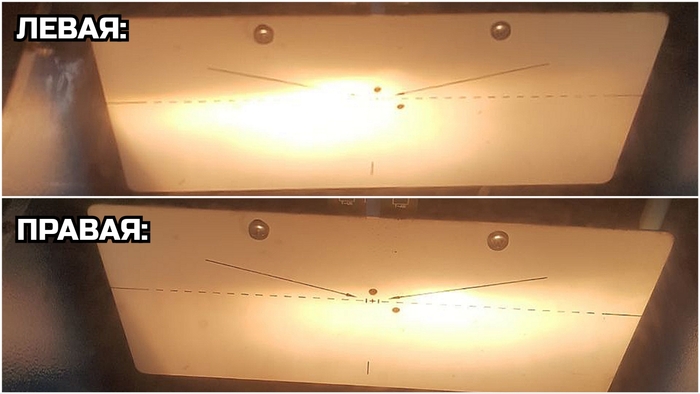 Левая фара требует регулировки, ведь она светит сильно левее чем должна - на встречку. Правая фара светит примерно прямо, но всё же есть куда стремиться, особенно по высоте. Отрегулируем обе.