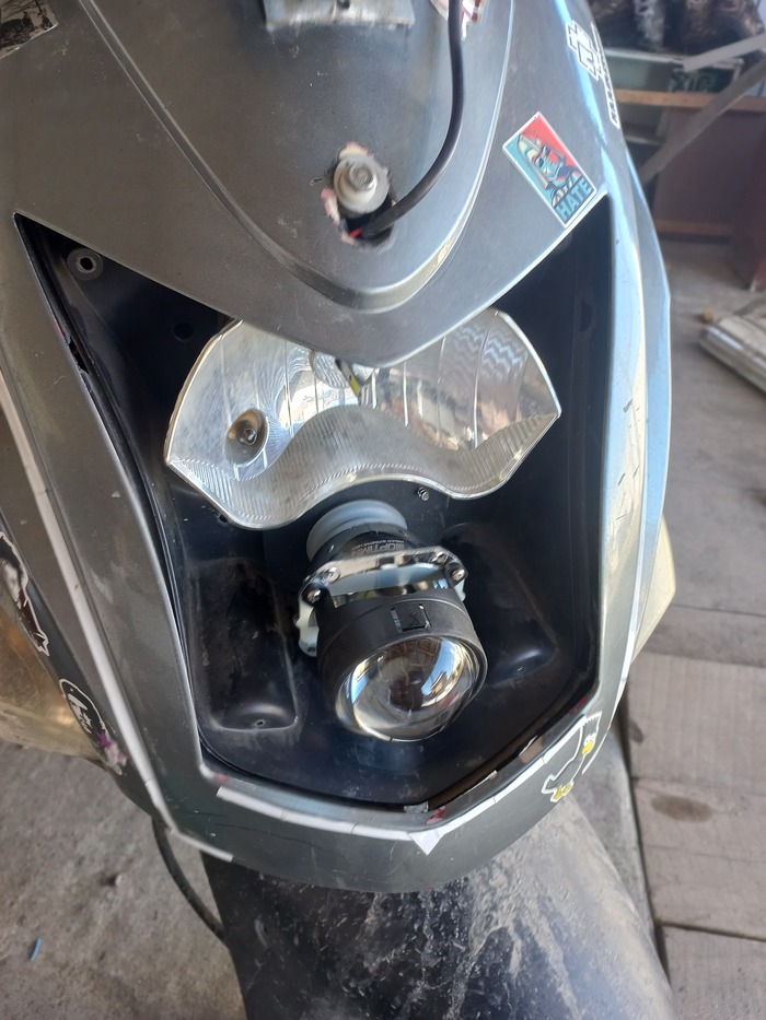 Конечно, обошлось не без минусов. Та часть дорожного полотна, которую на автомобиле не видно из-за капота, на скутере хоть и освещена, но слабо. В целом сравнимо со штатным светом. Теперь все неровности видно не прямо под колесом, а заранее. Решу, скорее всего, диодной лентой.