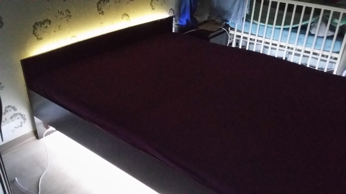 Конечный вариант... получилось ярче, чем я изначально планировал... но когда включено только изголовье, где лента забрана в кабель-канал (из-за этого желтый оттенок на фото... в жизни он тоже скорее выглядит холодным белым) получается очень уютно... ребенок вроде не просыпался... теперь правда подрос, и, если просыпается, сам ползет включать "щелк-щелк" :)